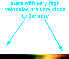 The resulting spectra show that the stars farthest from the core in this sample are moving at reasonable speeds, but closer to the central core, the orbital velocities become immense. This is a spectral signature of a supermassive black hole. The velocities of these stars indicate that 3 billion times the mass of our sun is stuffed into a volume about the size of Jupiter's radius. Anything that compact cannot resist the overpowering force of gravity and must collapse into a black hole.