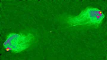 Just as gas interacting with a stellar black hole causes fireworks, the interaction of gas and stars falling into a supermassive black hole, circling faster and faster as they approach, cause explosions of gas traveling near the speed of light to shoot out from the core region. These jets are visible in radio light and were discovered with high resolution radio observations around many galaxies in the late 1970's. In the image above, the galaxy itself is coincident with the tiny little dot in center, between the two enormous radio lobes. In the drawing is shown the accretion disk, the gas and stars swirling together very fast as they approach the even horizon of the supermassive black hole. |