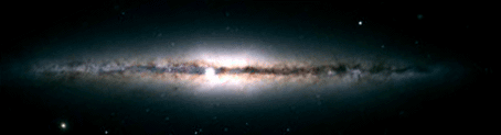 But since our solar system is located in the plane of the Galaxy, our view of it is edge-on. From far away, it would look like this galaxy, above, with dark lanes of dust and gas, obscuring the light from the inner regions.