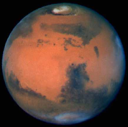 The moon looks white and Mars looks red for the same reason that a sweater looks blue. At visible wavelengths, these solid bodies reflect light from our sun. But at 70 °F Mars radiates at much longer wavelengths called infrared, where our eyes are not sensitive. The iron in Mars' dirt absorbs all the colors from the sun except red, which it reflects. Mars has a surface temperature of about 70 °F. Mars, the moon and even a sweater do produce their own light just as the sun does.